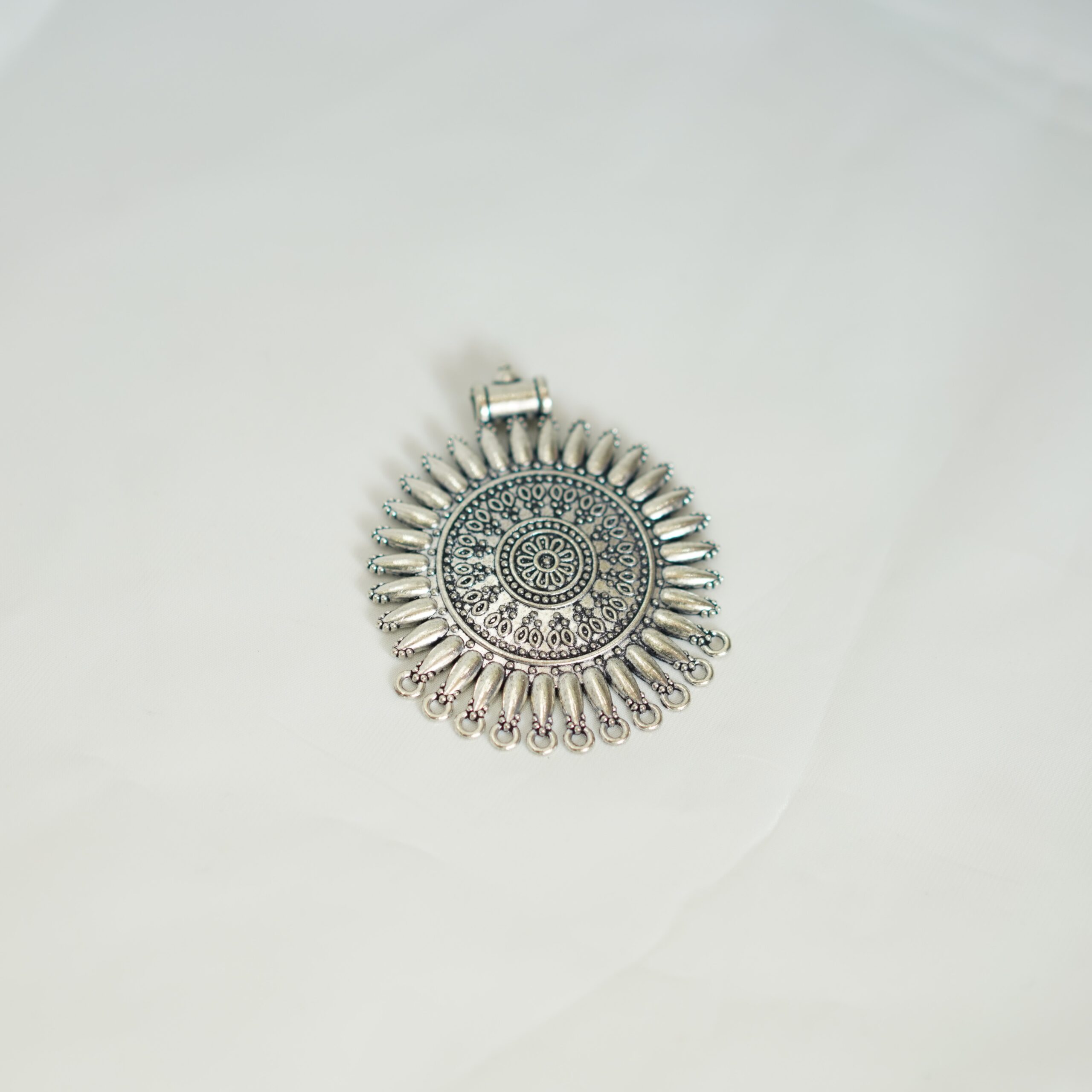 Embrace timeless elegance with this intricately crafted round ethnic pendant, radiating artisanal beauty and cultural charm. Inspired by traditional motifs, this silver-tone pendant features a detailed mandala-style floral center surrounded by a sunburst of etched teardrop patterns. Its vintage aesthetic brings a soulful and earthy vibe, perfect for elevating both casual and bohemian looks.