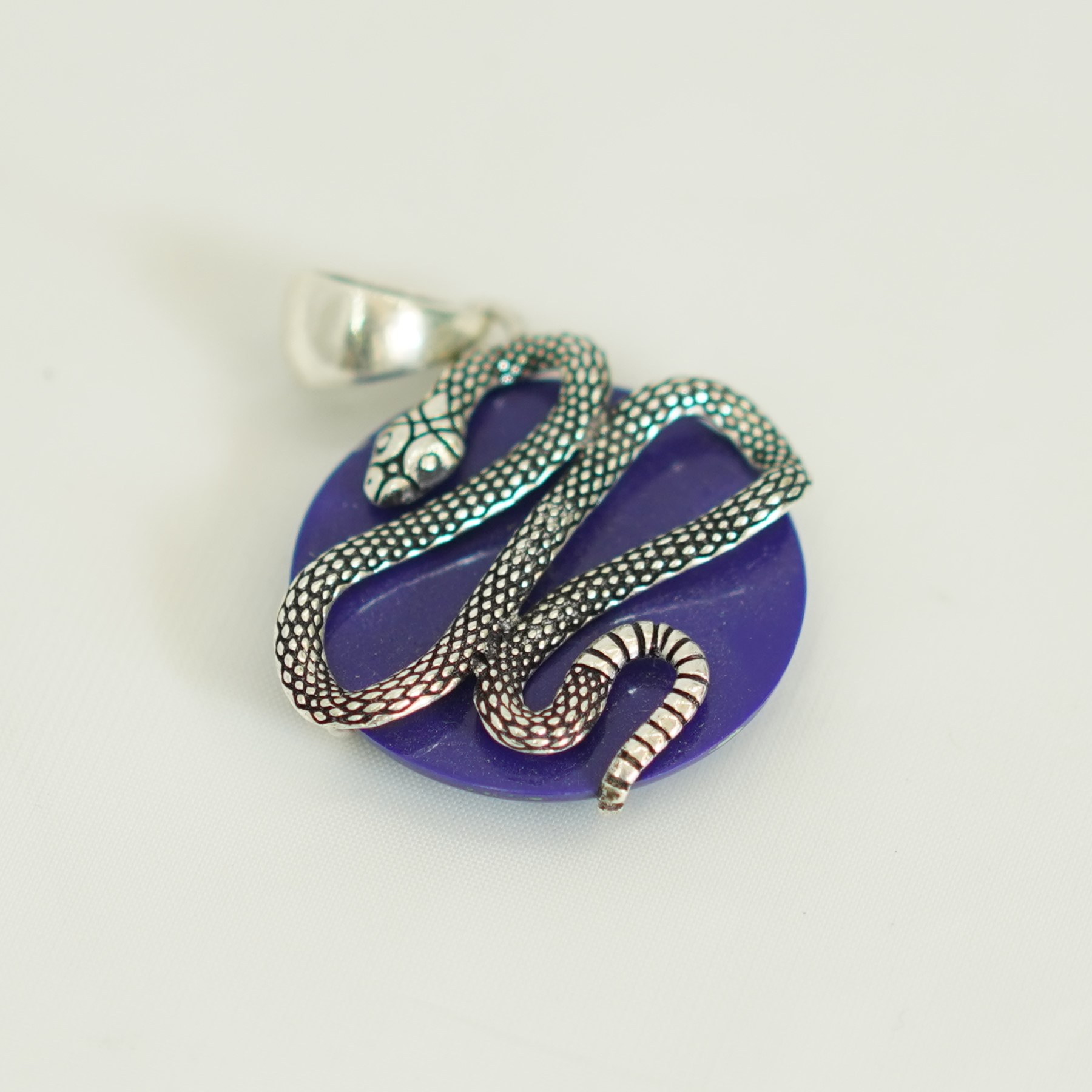 This captivating pendant features a detailed silver snake gracefully coiled atop a smooth purple gemstone. The serpent, a symbol of transformation and mystery, enhances the mystical aura of the deep violet stone. Whether you’re drawn to gothic, bohemian, or esoteric styles, this unique piece makes a bold statement.
