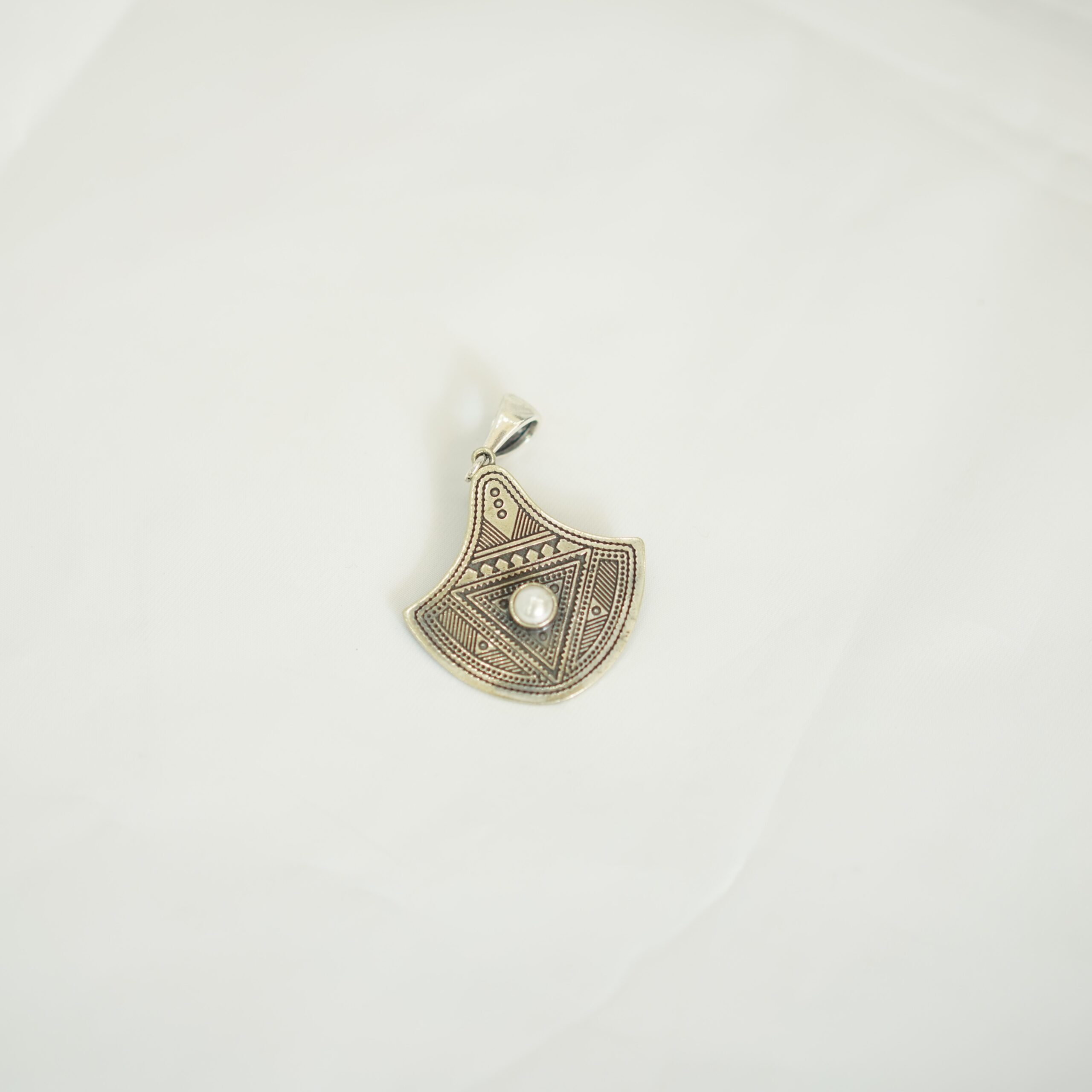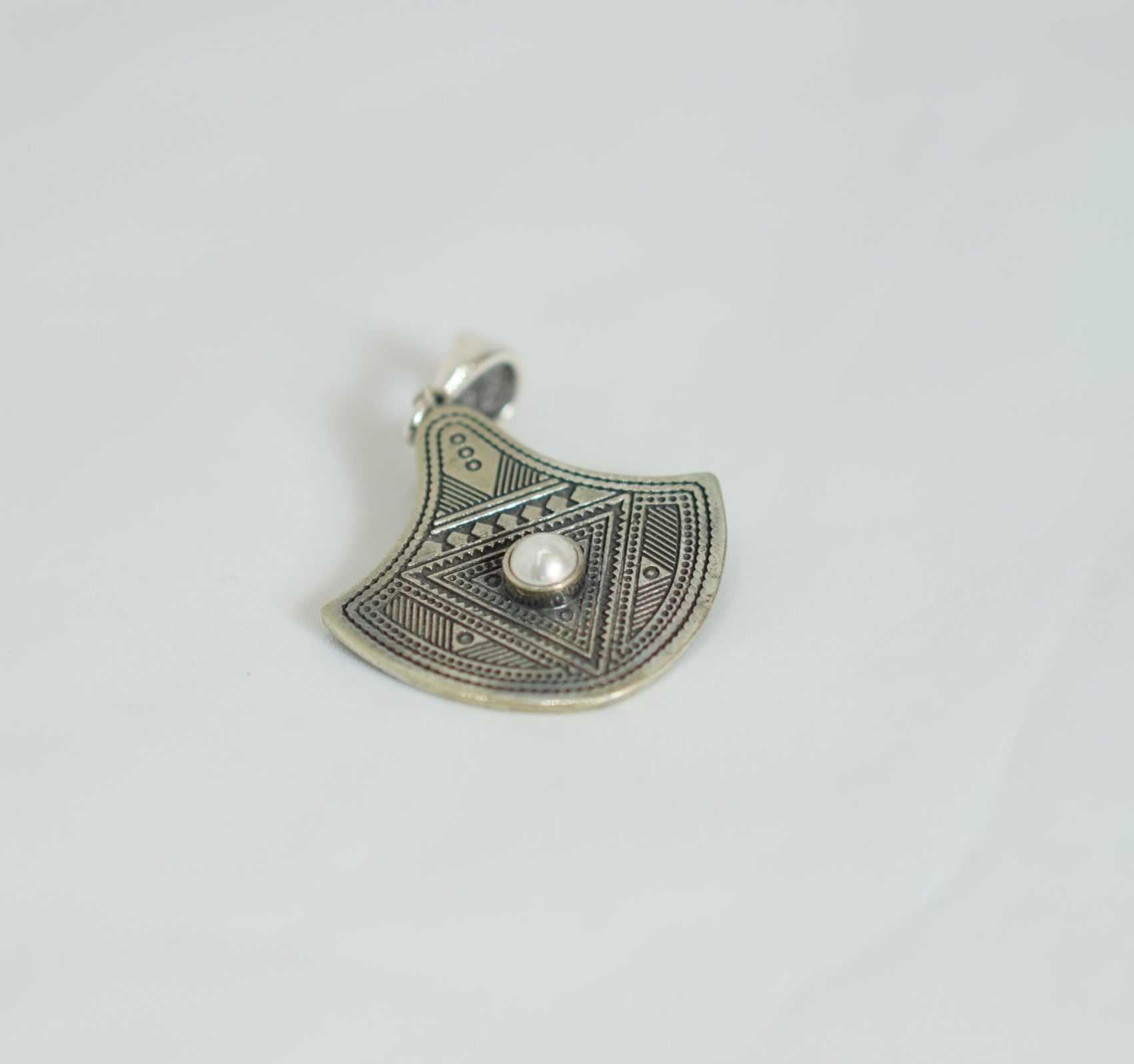 This beautifully crafted ethnic pendant draws inspiration from Tuareg and Amazigh (Berber) traditions, reflecting the rich symbolism of North African art. The piece is shaped like a stylized axe or shield, with finely engraved triangular and linear motifs that symbolize protection and identity.