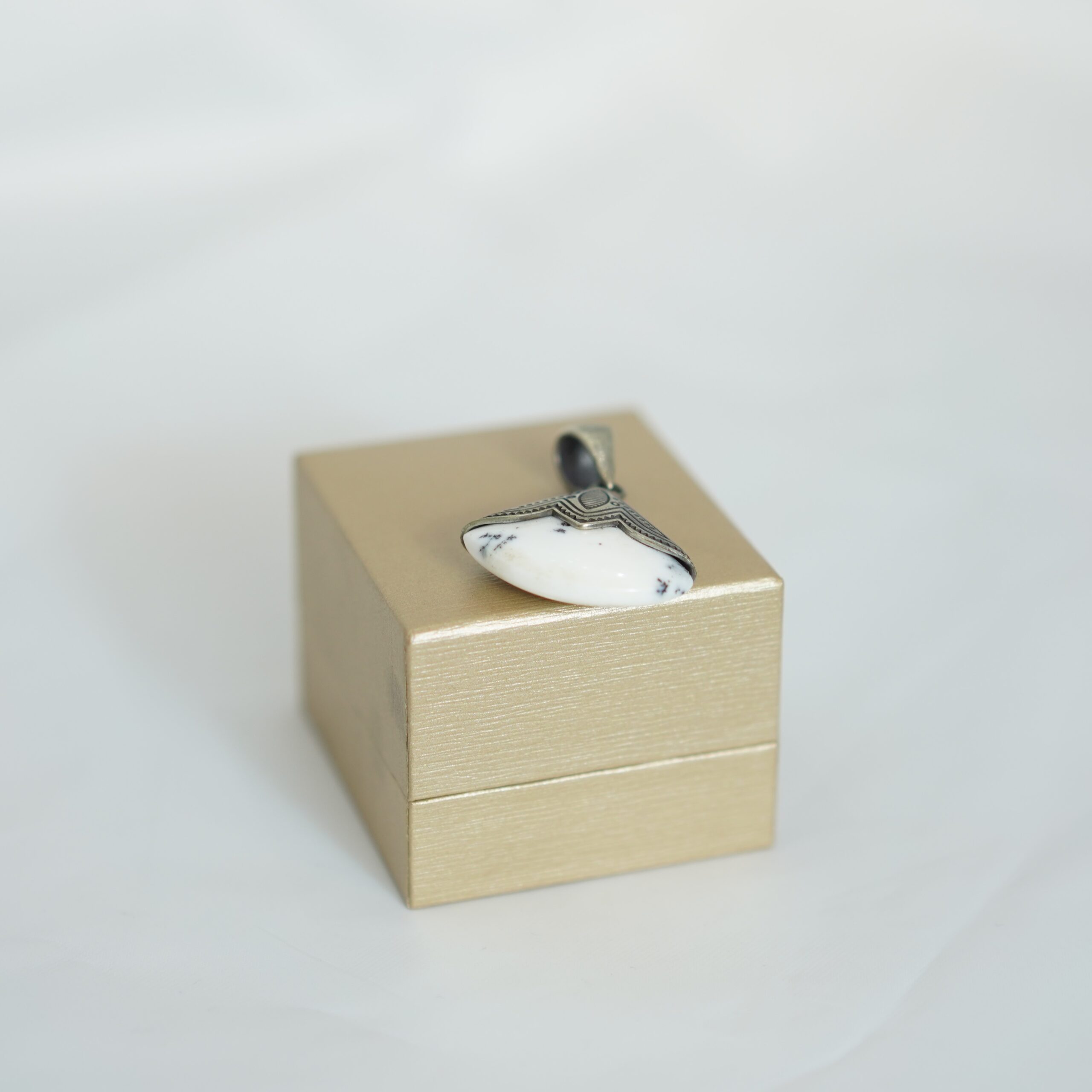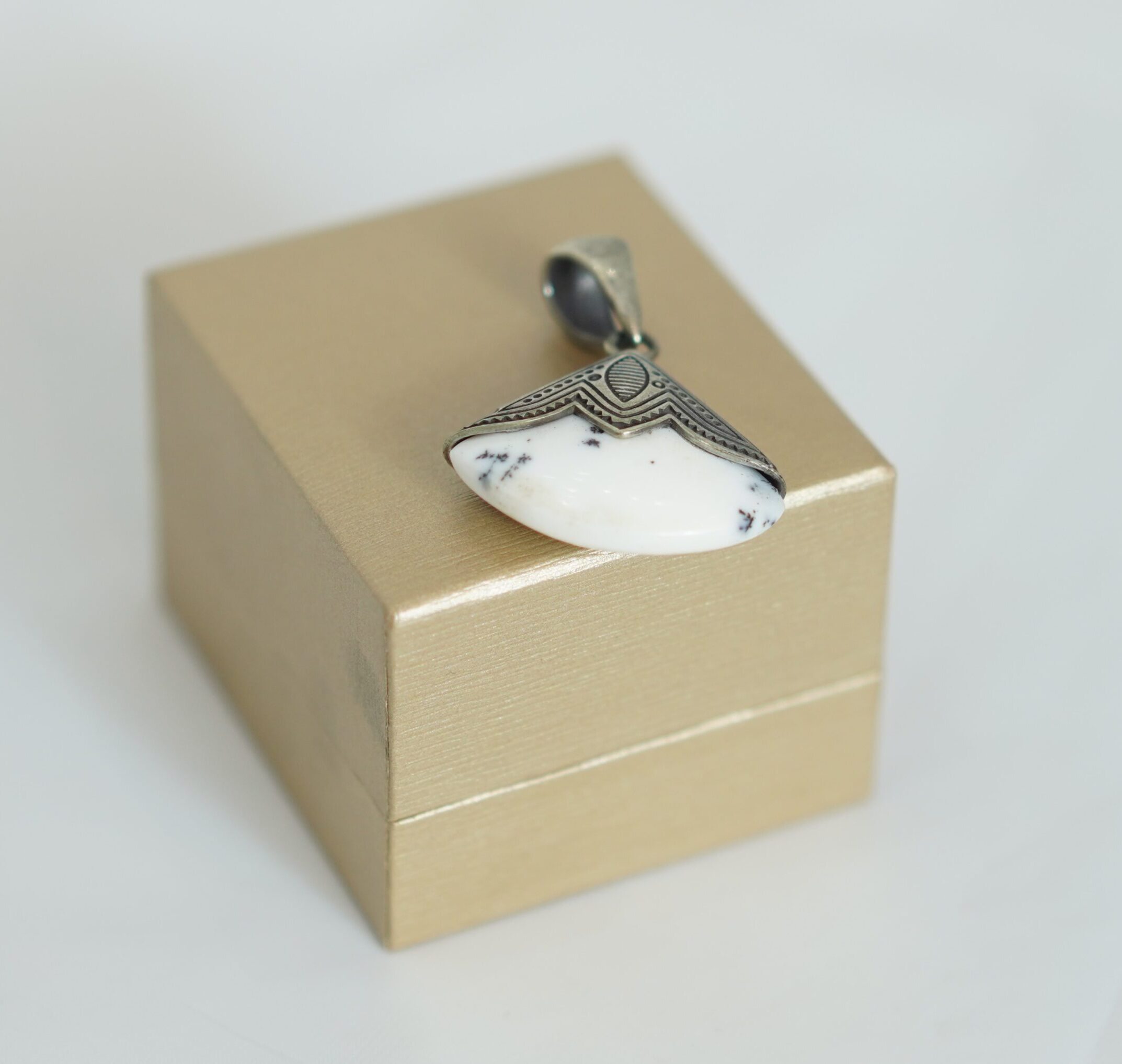 This handcrafted pendant is a stunning fusion of Victorian elegance and natural mysticism. At its heart lies a striking dendritic opal, also known as Merlinite, renowned for its magical appearance and spiritual energy. The stone is oval-shaped, large, and polished to enhance its natural veining, giving the impression of miniature landscapes or frost-covered trees.