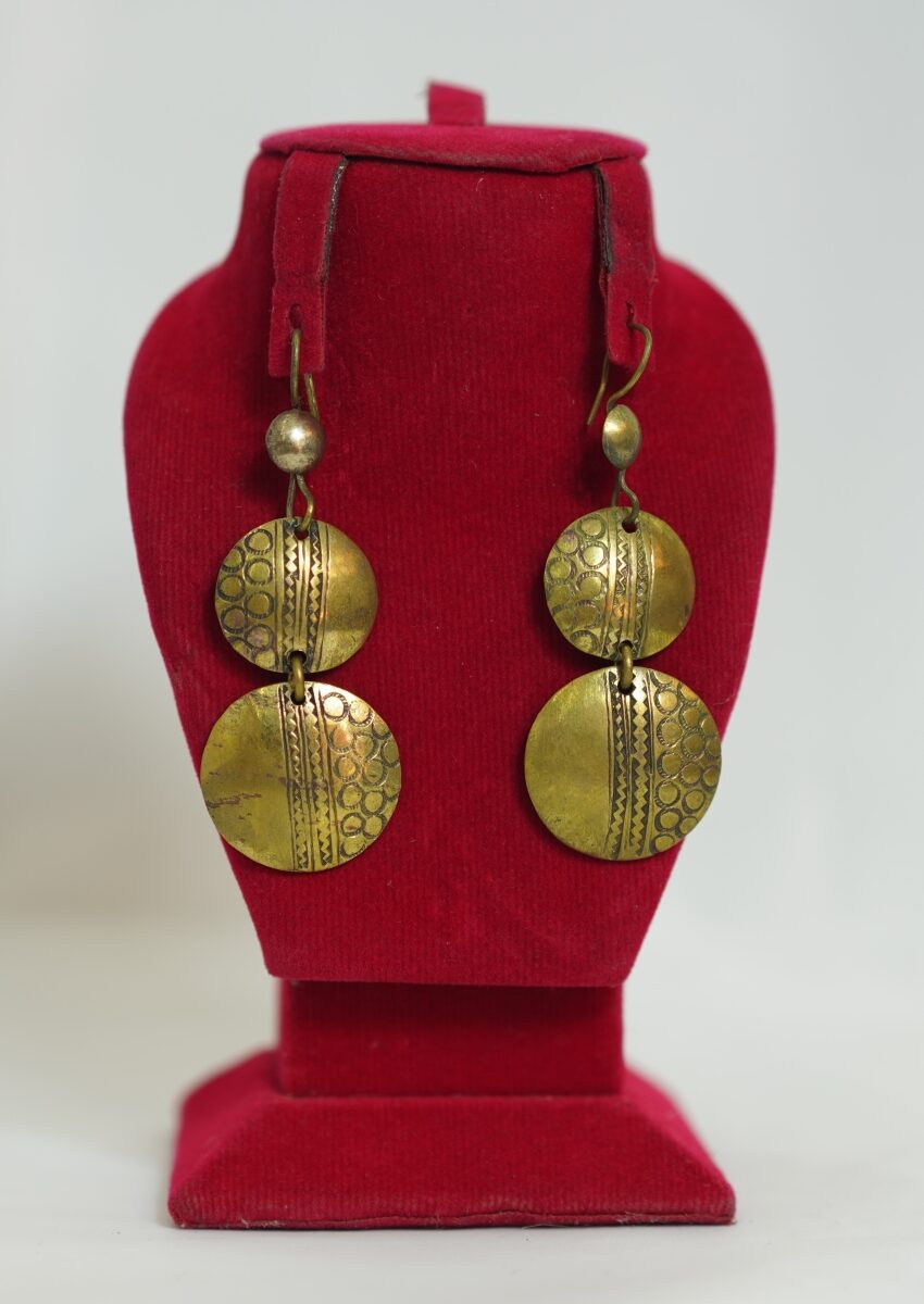 The warm golden tones of brass, combined with the distinctive dual-disc design, create a captivating blend of vintage charm and cultural artistry—perfect for both everyday wear and special occasions.